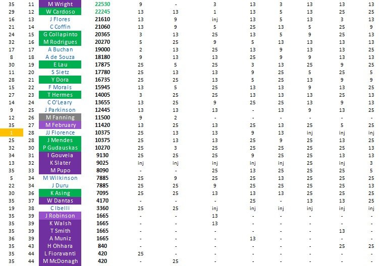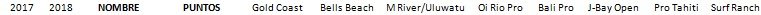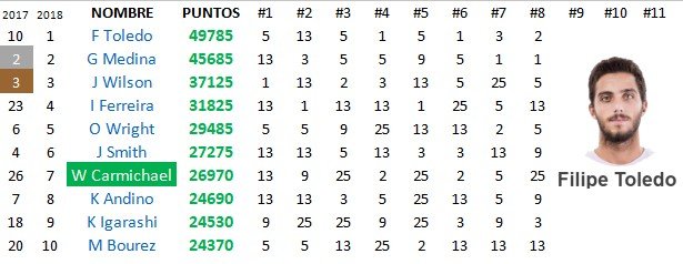 En las últimas posiciones nos encontramos con los Wildcards (invitados) y reservas, alguno que otro con más de una aparición, pero sin demasiada fortuna (bueno, menos Mikey Wright, entrando y saliendo del Top 10, que lleva un añito…)