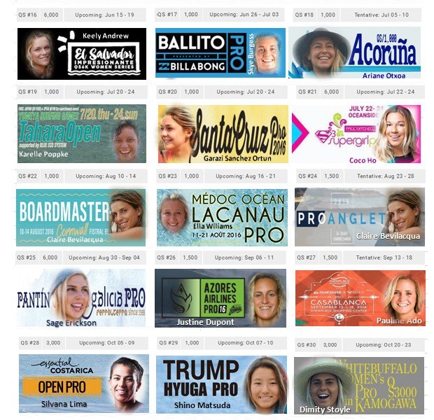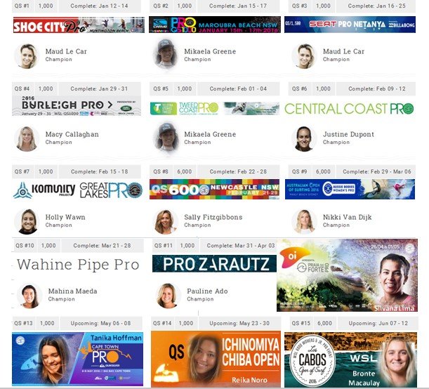 En 2016 regresa al CT Silvana Lima, con mucha fuerza, liderando el ranking del QS. Pero como siempre, entre las 10 primeras tan sólo vemos un par de surfers que no han estado en el CT, este año la segunda QS en clasificar es Pauline Ado